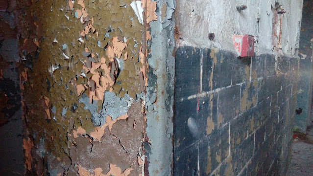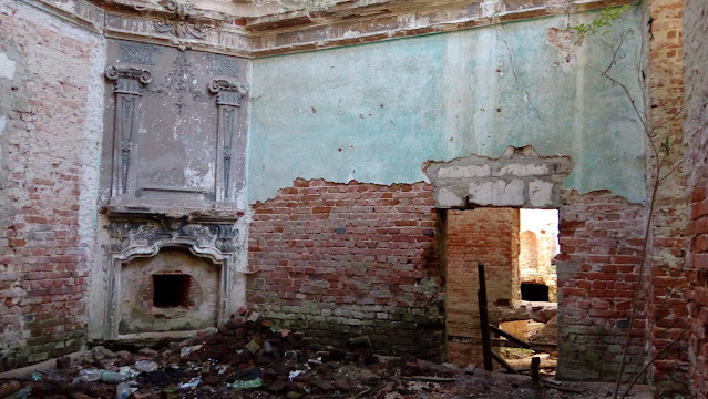 Pałac jest oficjalnie "w remoncie", oczywiście o żadnym remoncie nie ma mowy, rusztowania mają stwarzać pozory, że prace są w toku, tymczasem nic się tutaj nie dzieje. Wdrapuję się do środka po drewnianej belce, przy okazji wbijając sobie 2-centymetrowe szkło w stopę. Wewnątrz raj wspinaczkowy po metalowych rusztowaniach. Uważne oko dostrzeże ukryte detale jak namalowane na ścianach herby czy ozdobne kafelki na podłodze. Dach w jednej części całkowicie się zapadł, wygląda to kiepsko. W jednym pomieszczeniu znajduję ocalałe fragmenty gipsowych płaskorzeźb - robią wrażenie.
